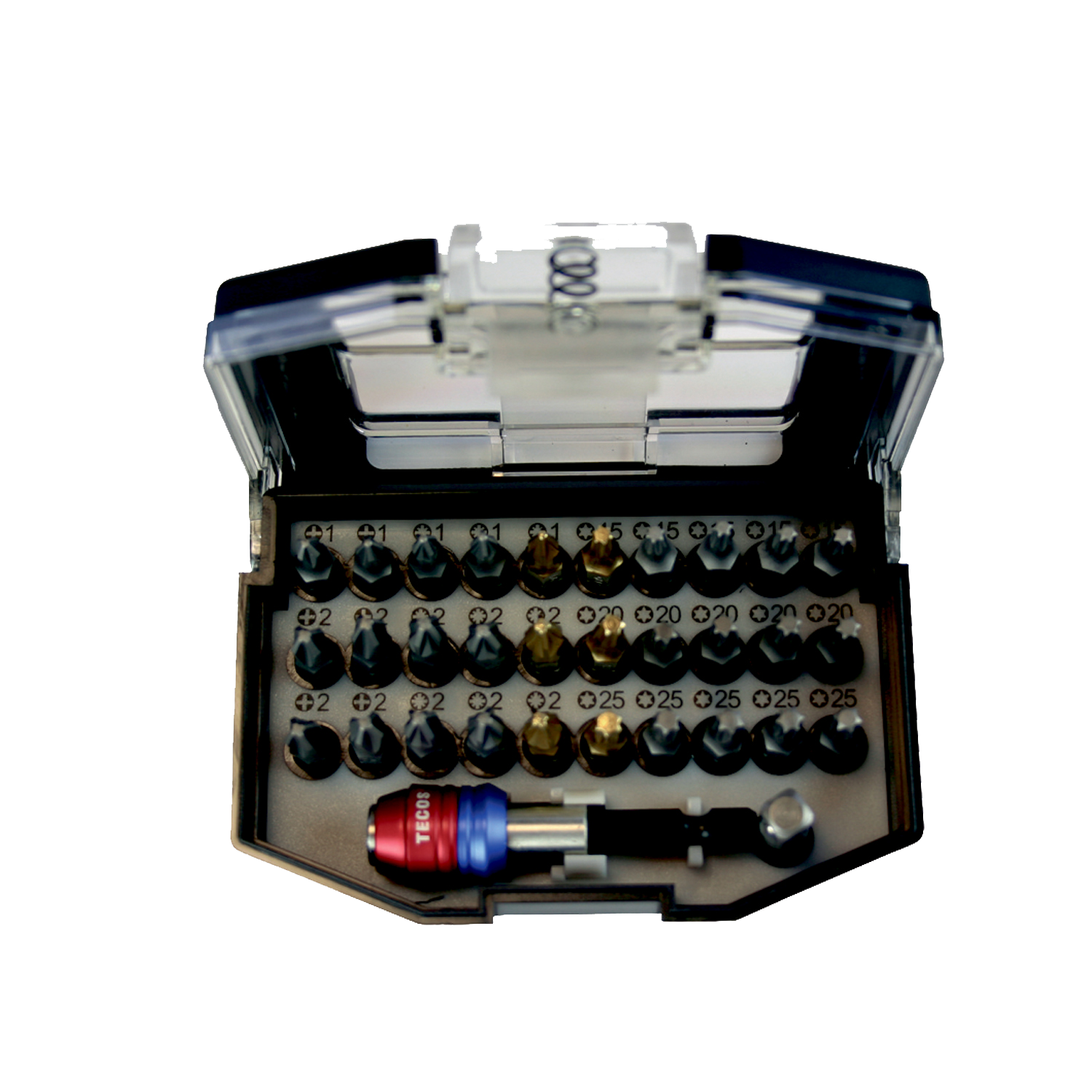 Industrisæt i ekstra kraftig bits æske. De mest anvendte bits leveres i titanium udførsel der sikrer en meget længere levetid end traditionelle. bits