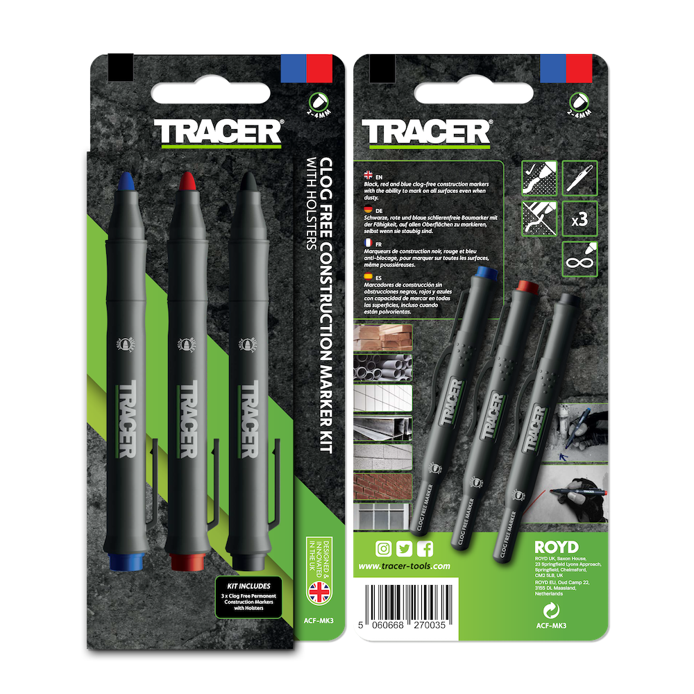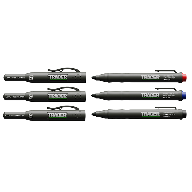 Tracer clog free tusch sæt 1xsort, 1xblå, 1xrød. I æske. 10 æsker i display