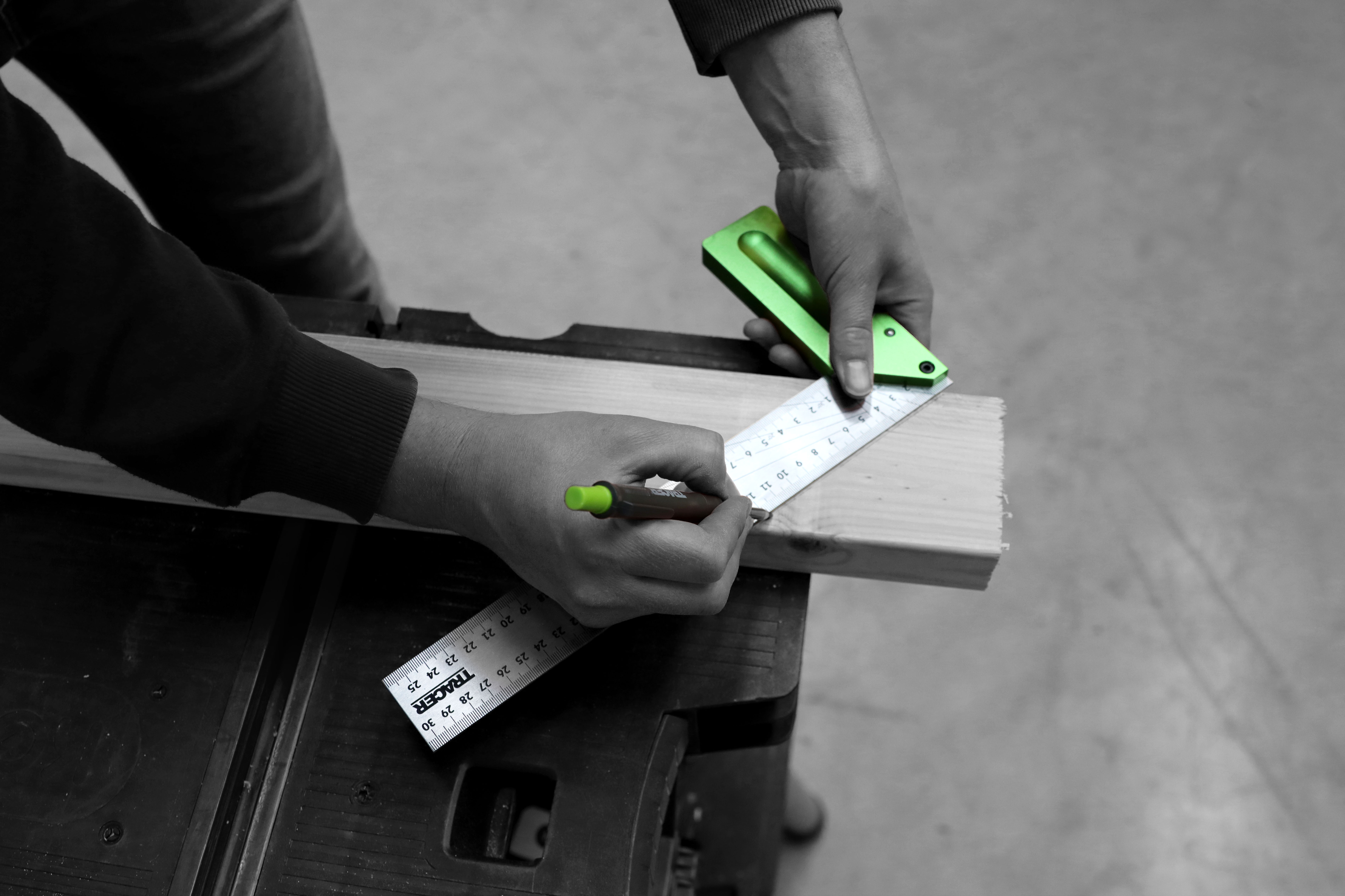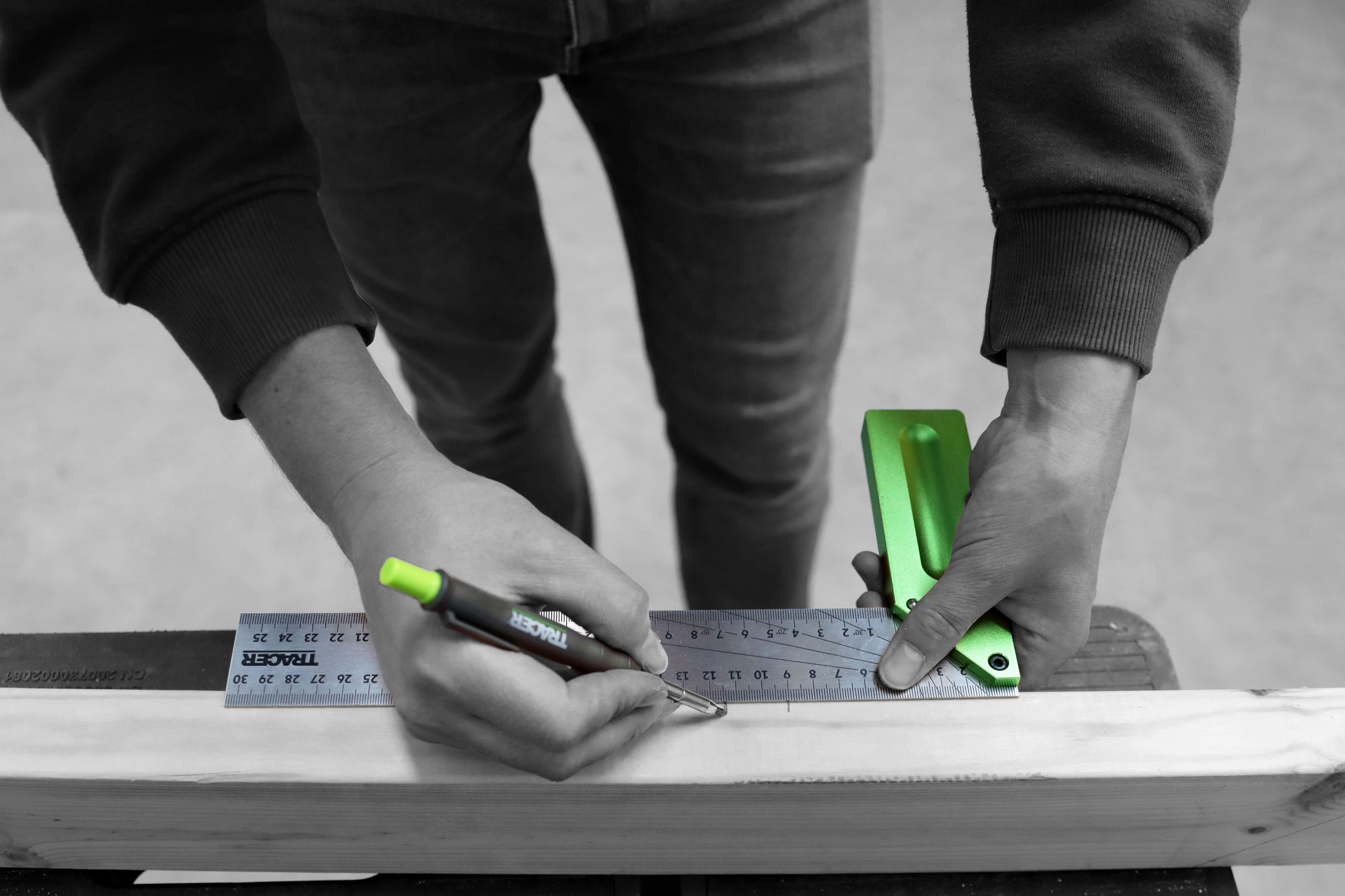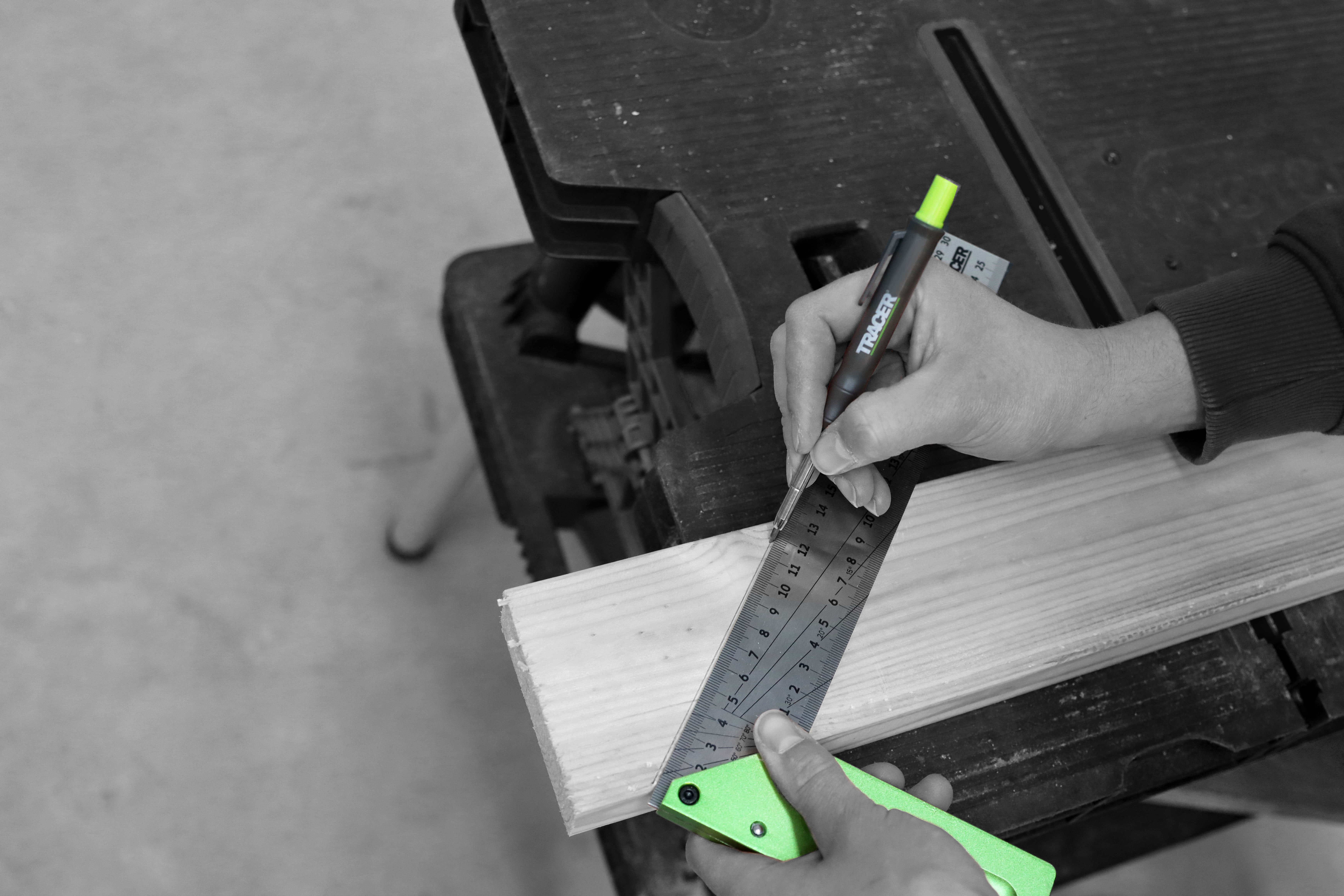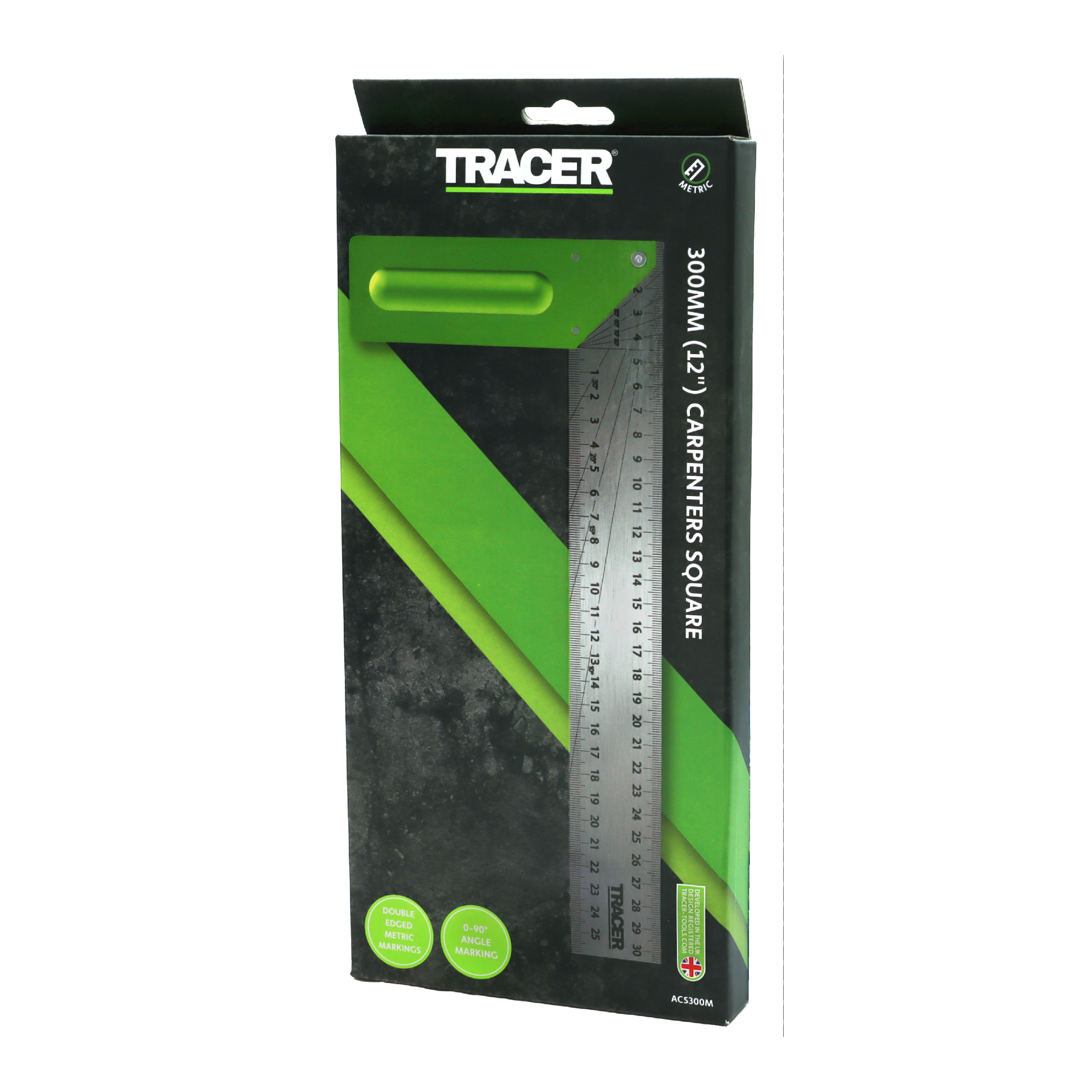TRACER 300 mm (12") tømrerfirkant med dobbelt lasergraverede markeringer til indvendig og udvendig opmærkning samt 0–90° vinkelmarkering.