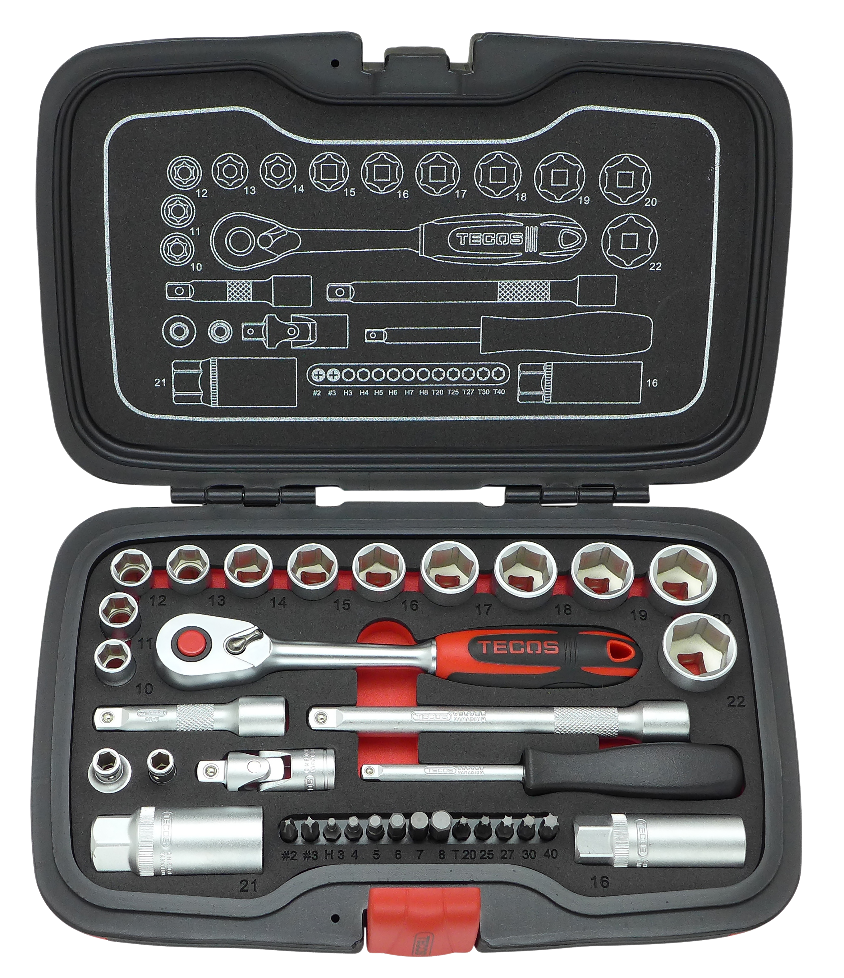 Topnøglesæt med tændrørstoppe, toppe og bits.