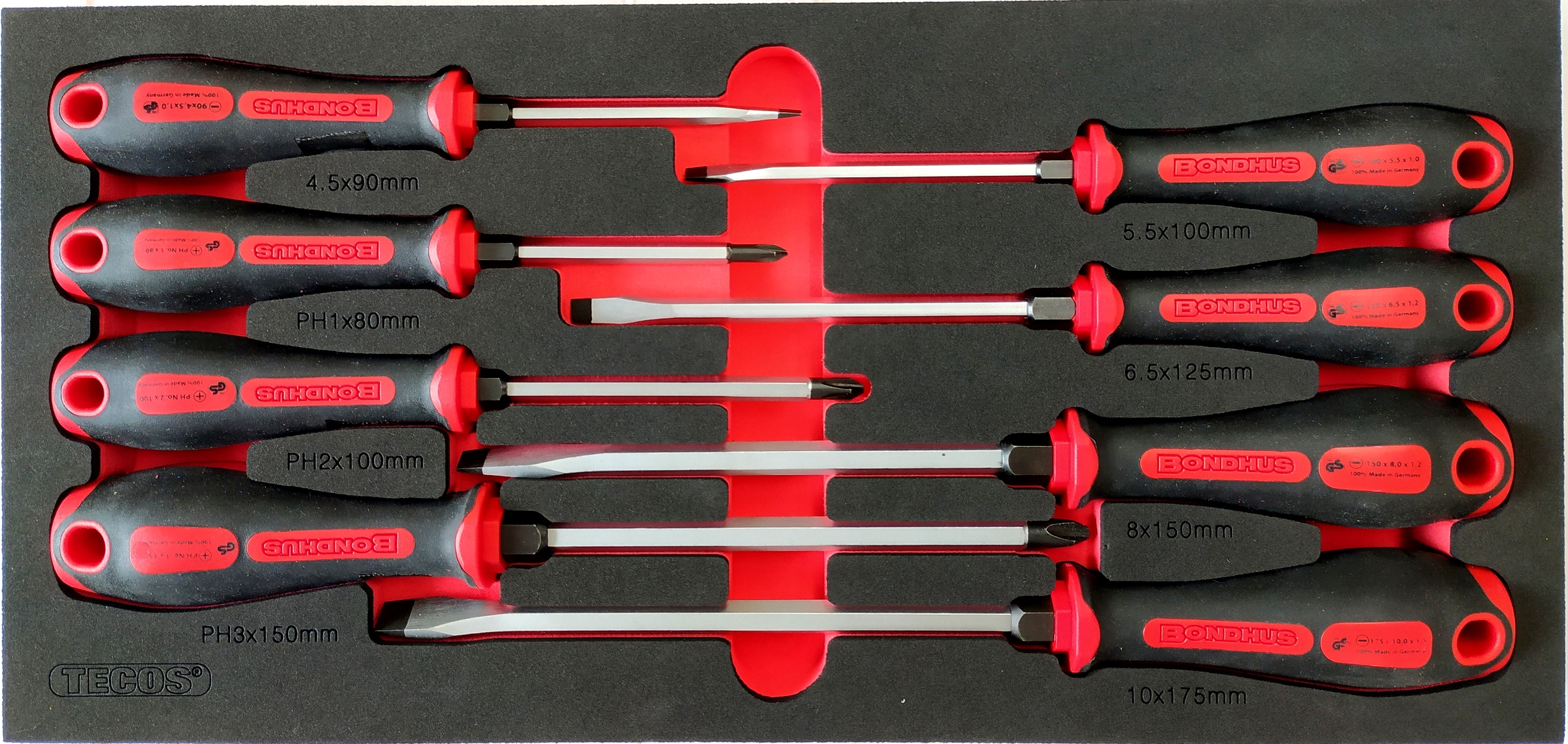 Tecos Skruetrækkersæt bestående af 8 skruetrækkere i PH og lige. Kraftig hex klinge og slagfast kerne. 8 dele Bondhus.